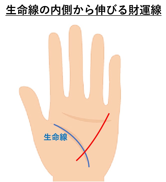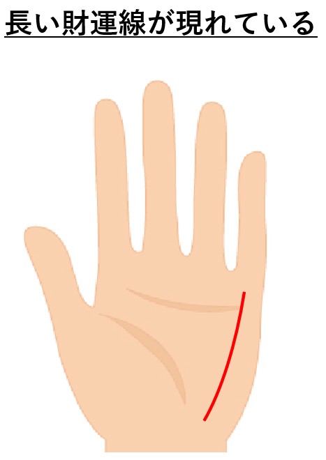 財運線が感情線を突き抜けて生命線の内側下部まで伸びる手相は、珍しい吉相とされています。このような長い財運線がある人は、周囲から多くの支援を受けることで成功を収めることが出来ると言われています。親戚や仕事での繋がりによる縁が強く、この縁を上手く活かして金財を得ることができるとされています。成功された方には、ご家族の稼業や継いで財を成す方もいらっしゃるようですね。