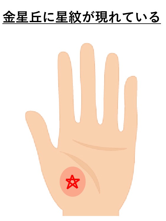特に、芸能や音楽、美術などのクリエイティブな分野での成功が期待できるとされています。 星形の紋は、5つの点が集まってできる形状を指し、これが明確に見える場合は運気の集中を意味します。金星丘にこの紋がある人は、人を惹きつける魅力や才能を持ち、それが経済的成功につながりやすいとされています。 また、この手相は単なる金銭的な成功だけでなく、人々から愛され、尊敬される存在になれる可能性も示すと考えられています。その結果、多くの支援者や協力者を得て、人生において大きな成功を収める可能性が高まります。