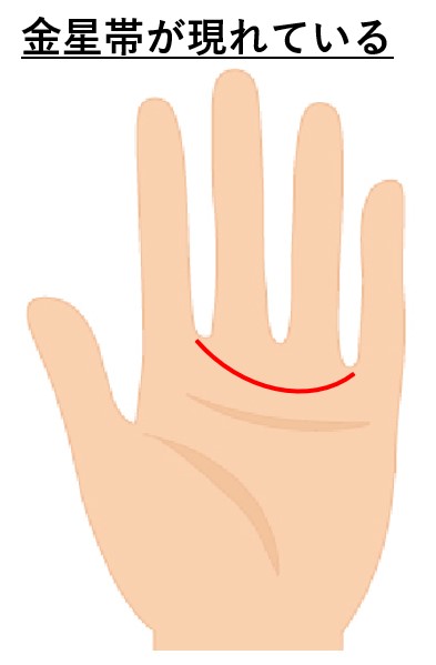 金星帯ですね。金星帯は、人差し指と中指の間、および薬指と小指の間を半円でつなぐように結ぶ線を指します。この線が手のひらにはっきりと現れている場合、金運上昇の兆しとされています。