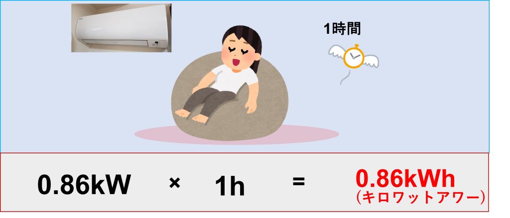 では電気代の単価と単位を合わせるためにkWhへ変換を行いたいと思います。 kWhは、1kWの消費電力を1時間使った場合の電力量を表しています。 単位を合わせるためエアコン暖房を1時間使ったと考えると、消費電力量は0.86kWhと表すことができます。 これで電気代の単価と単位を合わせることができます