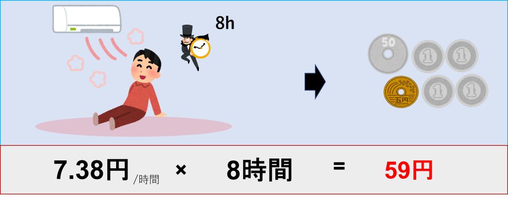 0.86kWhへ電気代の単価である25円/kWhをかけると、1時間当たり22.36円かかるということがわかります。 では仮に日中8時間エアコン暖房をつけっぱなしにするとどうなるのか考えてみます。 この場合、1時間当たりの電気代22.36円×8時間となり1日約179円となります。 さらに1か月続けると,5366円となります。