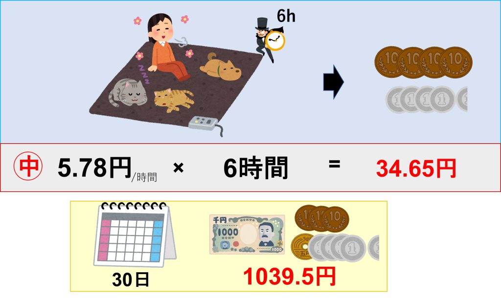 電気代もすべて七割として考えることができ、1時間当たりの電気代は約5.78円、6時間の電気代は、34.65円 1か月の電気代は、1039.5円ということになりますね。
