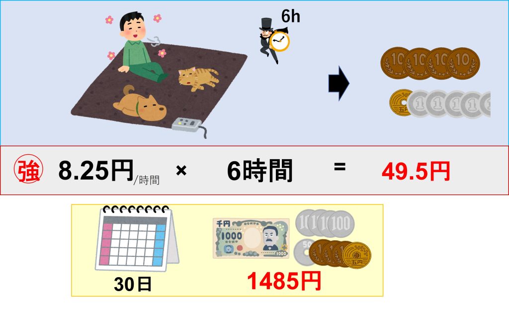 真冬の寒い日々が続くとホットカーペットをつけっぱなしにしたまま過ごすことも増えてくるため、電気代が気になる方も多いと思います。