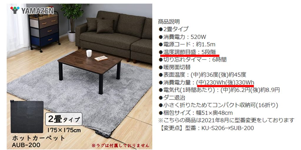 今回はアマゾンのホットカーペット売れ筋ランキング第一位の山善製ホットカーペットで考えます。 サイズは2畳向けですね。6時間で自動で切れるタイマー付きの製品です。 5段階切り替えができますが、目盛り5/5の強モードと、目盛り3/5の中モードの2種類モードについて記載があります。