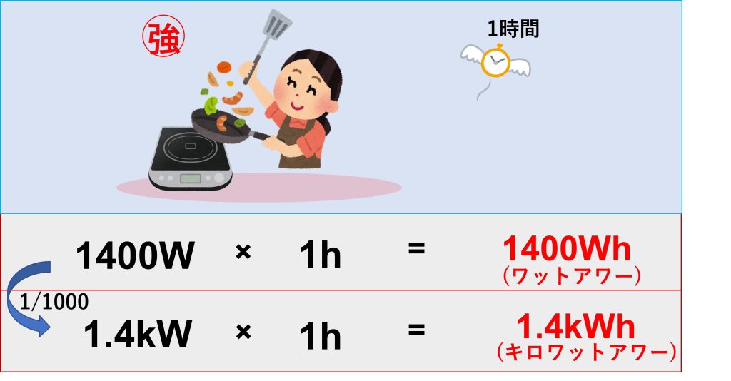 ワットで表示されていますが、これを電気代を算出するための単位である、キロワットアワーで表すとどうなるでしょうか。まずIHクッキングヒーターを1時間使った場合、1400Whと表現することができます。