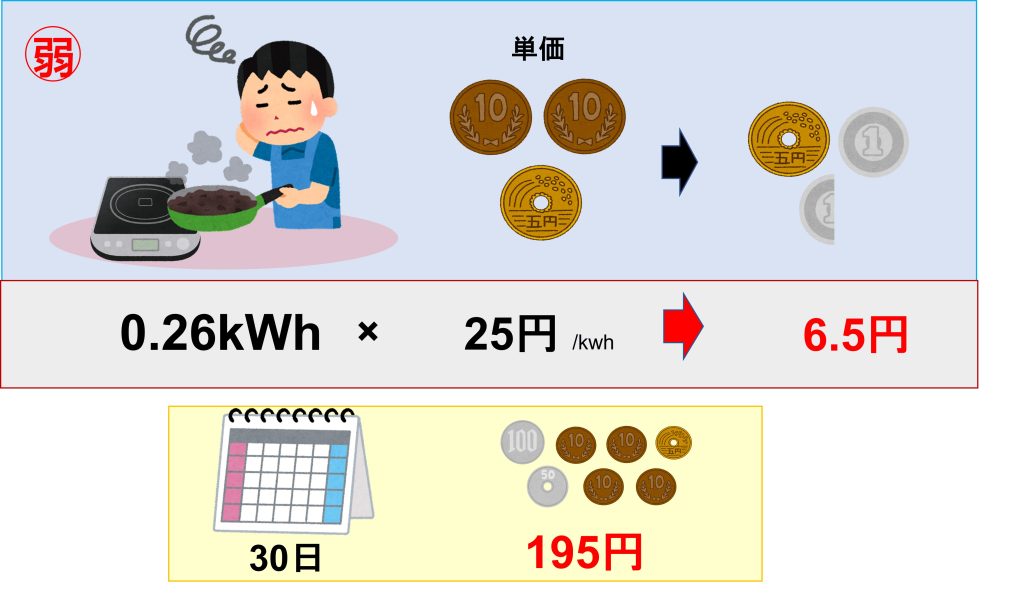取扱説明書を確認すると中火は450W~900W,弱火は150~260Wとなっています。今回はは中火は700W、弱火は260Wとして、電気代を合わせて確認してみます。