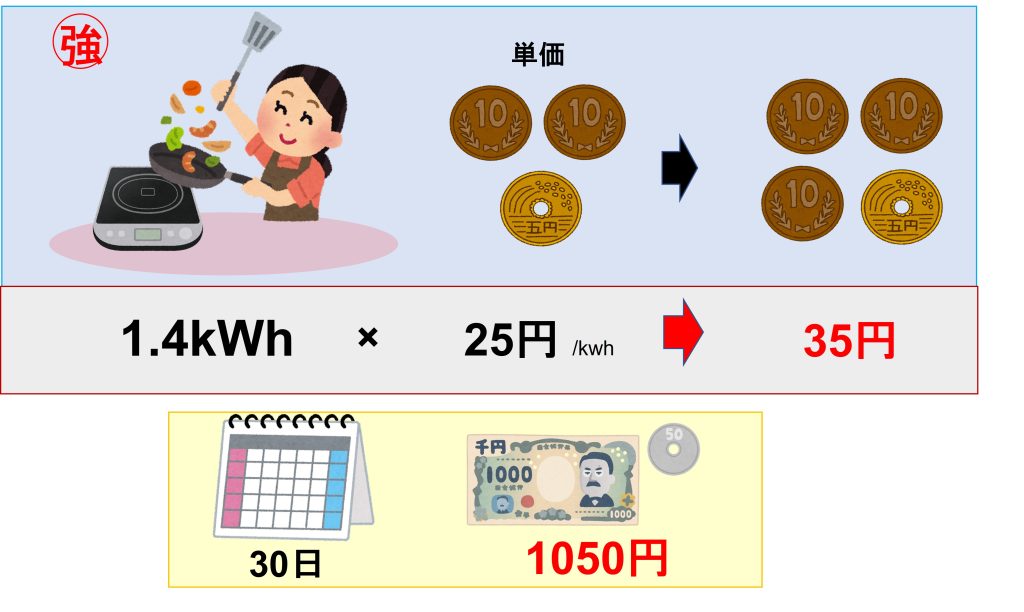 先ほどの1.4kWhに単価の25円/kwhをかけると、35円ということになります。 つまりIHクッキングヒーターを1時間使うと約35円の電気代がかかるということになります。