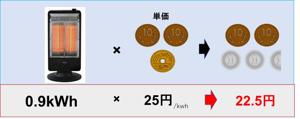 1kWhあたり25円ですので、この場合は25円を0.8倍して、20円となりますね。つまり1時間電気ストーブを使うと約20円かかるということです。では実際に使用シーンを想定して、起きている間ストーブで部屋を暖め続けた場合を考えてみます。