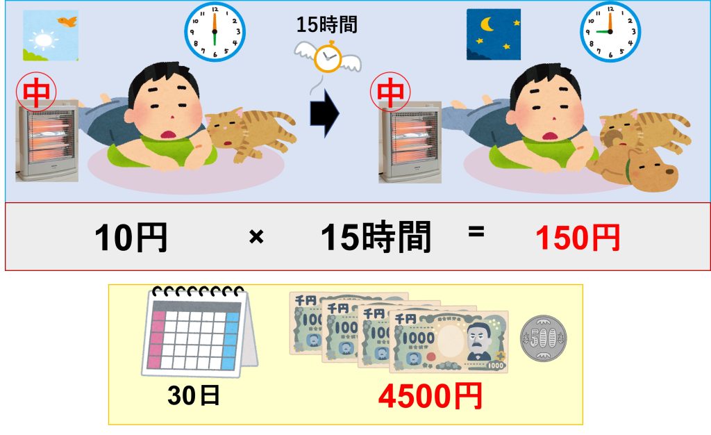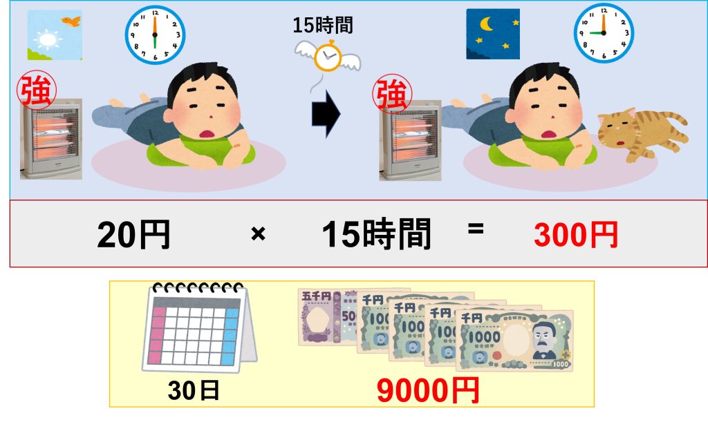 例えば、朝6時から夜21時まで15時間使ったとすると、 1時間当たりの電気代20円を15倍して、1日300円ということになりますね。 さらに30日間、使ったとすると、300円×30日のとなり1か月の電気代は9000円ということになります。 つまり、毎日15時間電気ストーブを使うと1日300円、1か月で9000円の電気代がかかるということですね