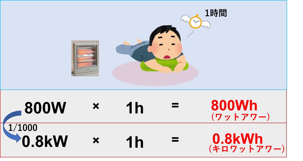 電気代の単価は、1kWを1時間使った場合を25円として計算していきます。まずW表示なのでkWへ単位を変換したいので、1000分の1をすると0.8kWと変換できます。さらに電気ストーブを1時間使った場合、0.8kWhと表現することができます。