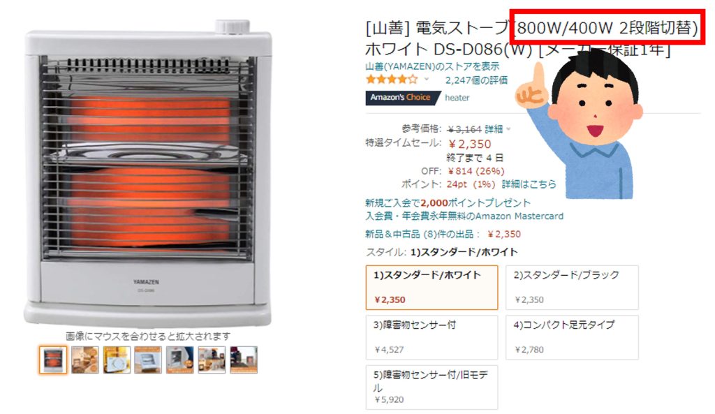 今回はアマゾンの暖房売れ筋ランキング第4位の 山善製電気ストーブの電気代を確認したいと思います! 早速消費電力を確認してみると、強モードでは800W,弱モードでは400Wと記載があります。 まずは強モードで電気代を算出してみましょう。