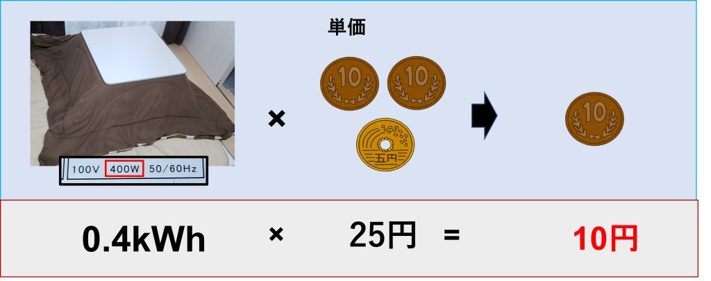 と計算することが出来ます。上記を踏まえて実際計算をすると0.4kWh×25円となるので10円と算出することができます。