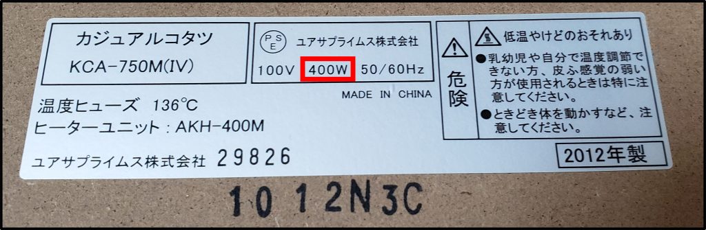 早速こたつの消費電力の確認をします。 消費電力は400Wと記載がありますね。こたつの温度を裏面のつまみを回すことで設定できますが、400Wという表示は一番強いモードでの消費電力を表しています。