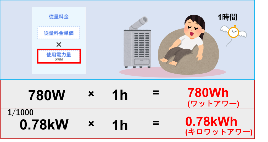 消費電力は760Wもしくは780Wと記載されています。 これは家庭用コンセントの周波数によって消費電力が異なるということなので、今回は消費電力の大きい780Wで考えます。kWhへ単位を合わせるためスポットクーラーを1時間使ったと考えると、消費電力量は0.78kWhとなりますね。