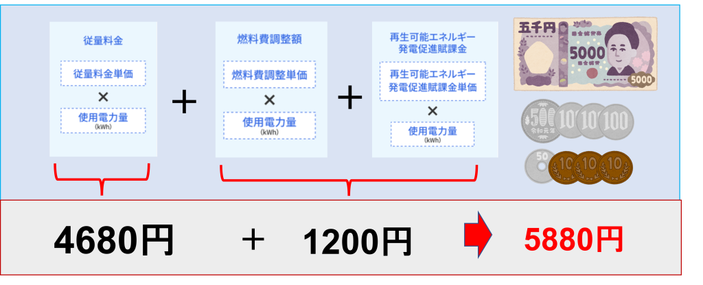 先ほどの結果と合わせて考えると、通常の電気料金に加えて燃料費調整額、再エネ賦課金を足すことで1か月5880円ということがわかりました。