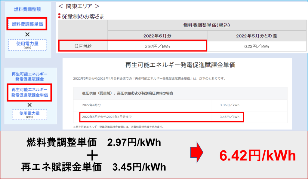 現在、燃料価格の高騰という状況ももありますので、燃料費調整額、あとは再エネ賦課金もさらに考慮して考えて行きたいと思います。東京電力の2022年6月の燃料費調整単価は2.97円/kWhですね。 また再エネ賦課金は2022年5月から3.45円/kWhとなりました。単価の合計は、6.42円/kWhとなります。