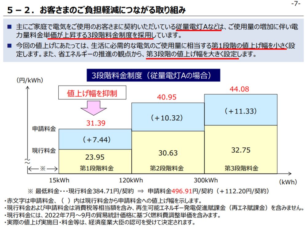 2つ目の従量料金の単価アップですね。 従量電灯Aでは使用した電力の増加に伴って単価が上昇する3段階料金制度となっていますね。 これは大手電力会社で採用されている料金方式になりますね。 この3段階の単価を上昇させるということですね。 3段階の上げ幅のうち、生活に必需的な電気使用料に相当する第一段階の上げ幅を比較的小さい上げ幅に し、その分第3段階の上げ幅を多めに設定するとのことですね。 ではこれらの変更によってどれだけ電気代がコストアップするのか見ていきましょう。