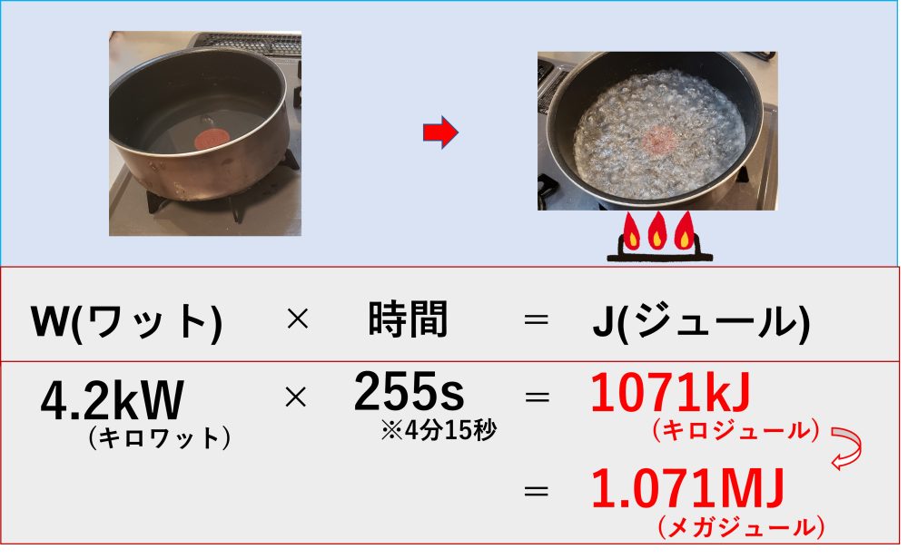 先ほどの4.2kWに使用時間をかけるとジュールという単位に変換することができます Wワットは1秒間のエネルギーに対して、ジュールはエネルギーの量そのものといったイメージですね。 結果4.2W×255秒となり、結果1071kジュールのエネルギーということがわかりました。 1000kが1メガなので、1000分の一をすると、コンロで1リットルのお湯を沸かすのに1.07MJのエネルギーを使ったことになります。