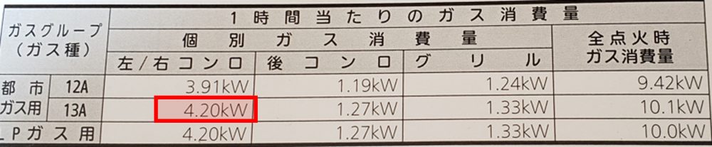 リンナイのガスコンロのガス消費量を確認すると、4.2kWと記載があります。つまり1秒間に4.2kWのガスを使用することになります。 ただ、このままではいまいちよくわからないので、ガスの単価に使用していた立法メートルへ変換したいと思います。 少し難しい変換になりますが、ゆっくり説明をしていきますね。