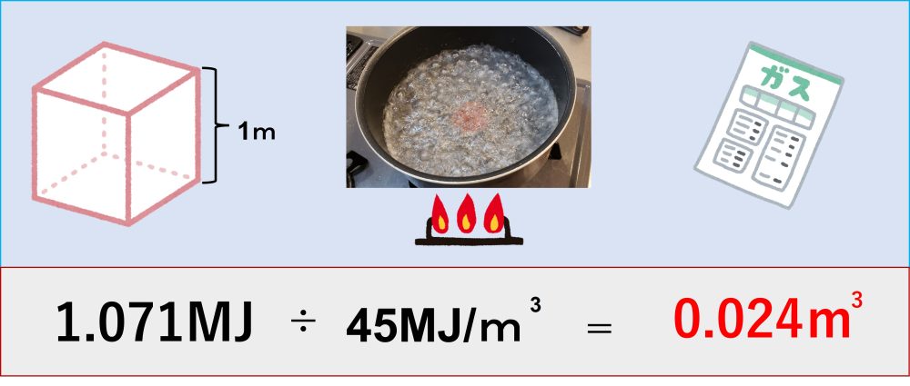 今度は、お湯を沸かすまでにかかった4分15秒という結果からガスの消費量が何m3(立法メートル)なのか計算します。