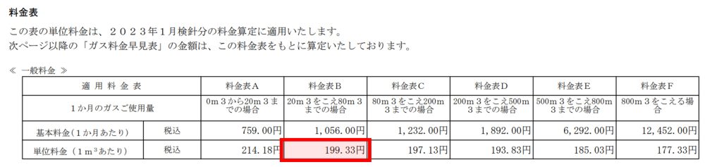 ガスの使用量に応じて単価が異なるのですが、今回は料金の中央くらいの料金帯の料金表Bで考えてみたいと思います。 料金表Bの場合、1立方メートルのガスを使用するごとに、199.33円かかるということになりますね。 言い換えると、ガス台の単価は199.33円/m3ということになります。