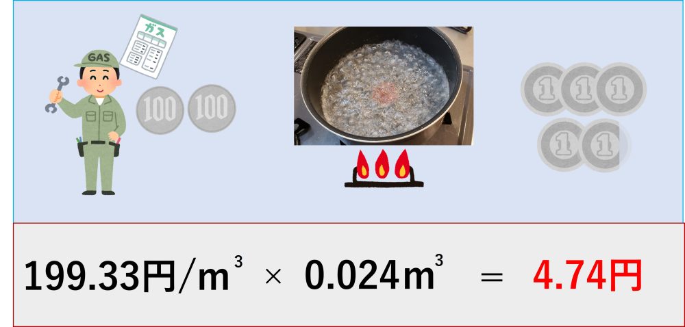 最後にガスの使用量と、ガスの単価をかけることで金額を算出できます。 ガスの単価は、199.33円/m3×使用料約0.024m3をかけると結果 4.74円となります。 つまりガスコンロで1リットルのお湯を沸かすとガス代が4.74円かかるということになります。