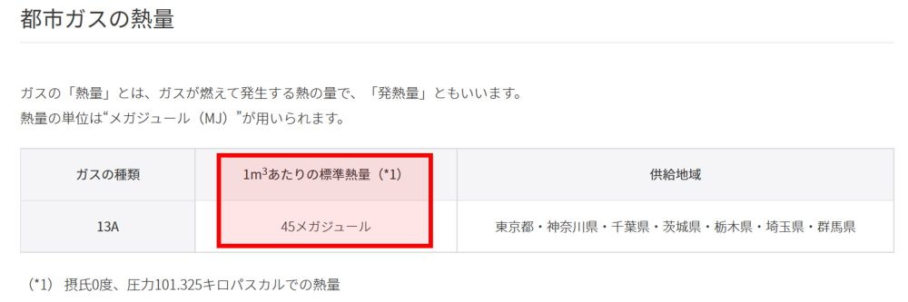 変換にはこちらの標準熱量という基準を使います。これは1立方メートルのガスが持つエネルギーを表す指標になります。 東京ガスのサイトを見ると標準熱量は、1立方メートル当たり45メガジュールと記載があります。 この指標を使って、コンロのガス消費量を確認します。